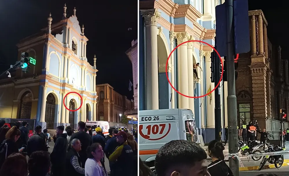 La noche de este lunes fue escenario de momentos de altísima tensión en pleno centro de San Miguel de Tucumán. Un joven, sin remera, trepó las rejas de la histórica Iglesia San Francisco, en la esquina de calles San Martín y 25 de Mayo, y permaneció en lo alto más de una hora, generando preocupación y pánico entre los peatones.